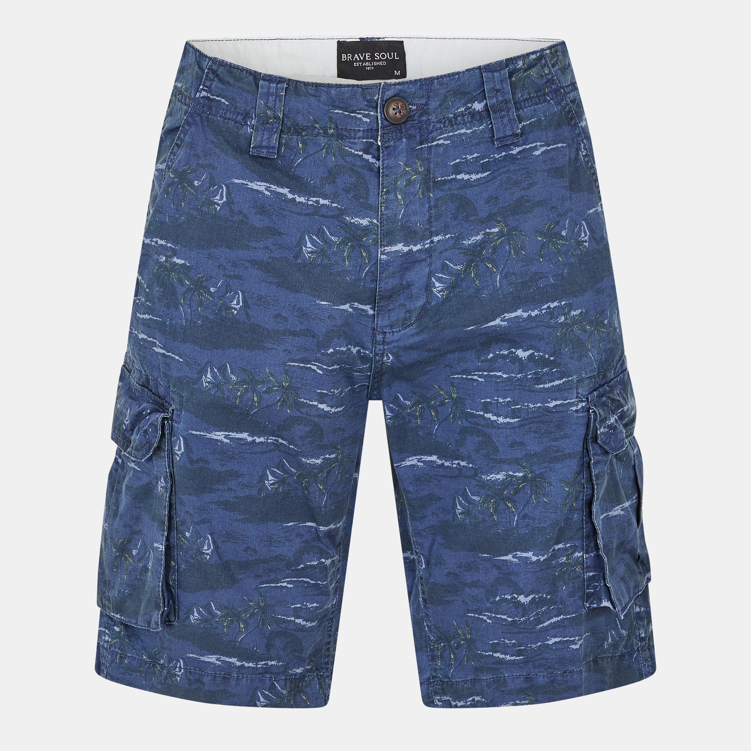 Brave Soul muške kratke hlače. Dužine do koljena, s gumbom u struku i dva džepa na struku. Dva cargo džepa s preklopima, s cjelovitim toniranim uzorkom palminog drveta.