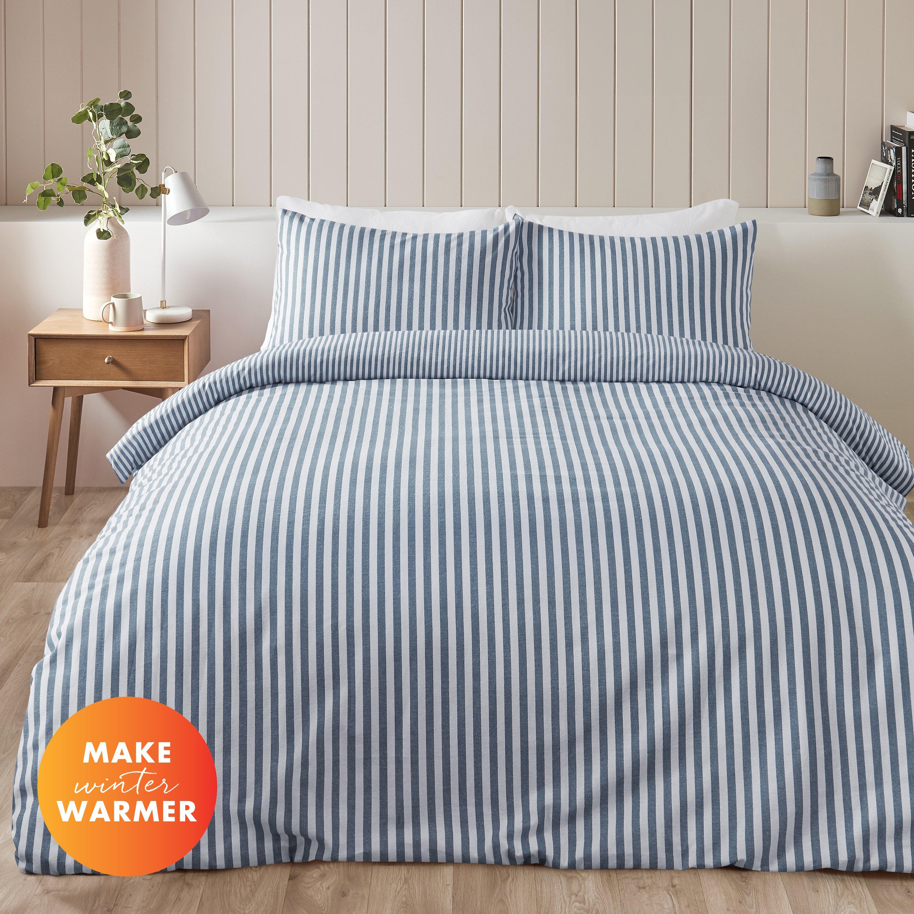 Transformirajte svoju spavaću sobu u elegantno i udobno utočište s ovim preokretnim posteljinom od brušenog pamuka. Ovaj set posteljine sadrži kontrastnu prugu u prirodnoj i plavoj boji, dodajući dašak sofisticiranosti. Izrađen od mekog i udobnog odgovorno nabavljenog 100% brušenog pamuka, ovaj posteljina obećava da će vas grijati i pružiti udobnost tijekom noći.