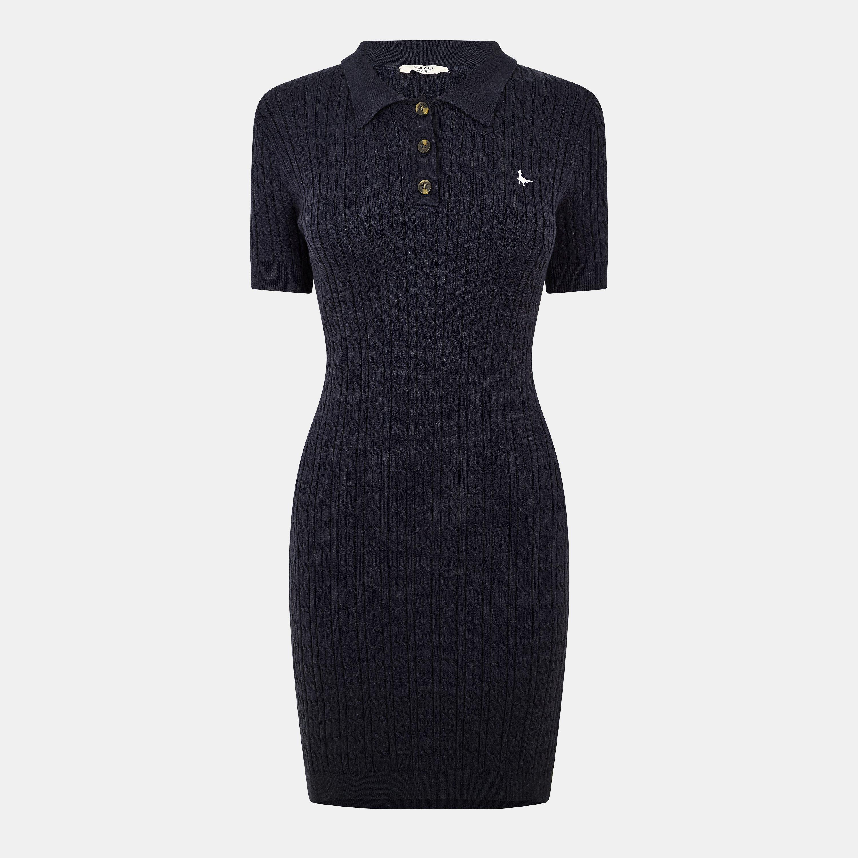 Ova haljina pletena je kabelskim uzorkom u klasičnom stilu polo majice, s kratkim rukavima i uskim krojem. Završava iznad koljena, s gumbima s brendiranom oznakom i bijelim vezom ikoničnog fazana gospodina Willsa.