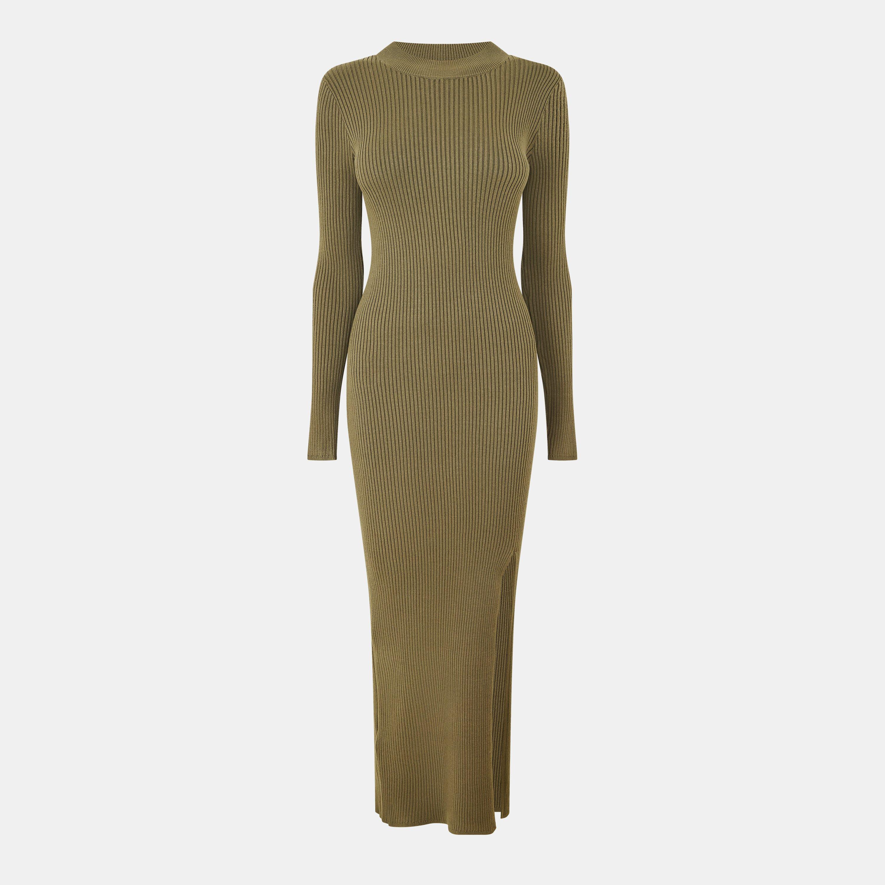 Ova silueta maksimalne duljine dizajnirana je kao dio naše jesensko/zimske kolekcije i prikladna je za prijelaz iz dnevnog u večernji look. Izrađena je od viskoznog materijala s mekanom i laskavom rebrastom konstrukcijom za pripijenu bodycon siluetu. U neutralnoj boji, ova komad garderobe ima visoki izrez na vratu, a konture na struku naglašavaju vaše obline i figuru. Sa strane ima prorez za suptilan prikaz nogu, a dugi rukavi pružaju dodatnu pokrivenost za hladnije mjesece. 72% viskoza, 28% poliester.