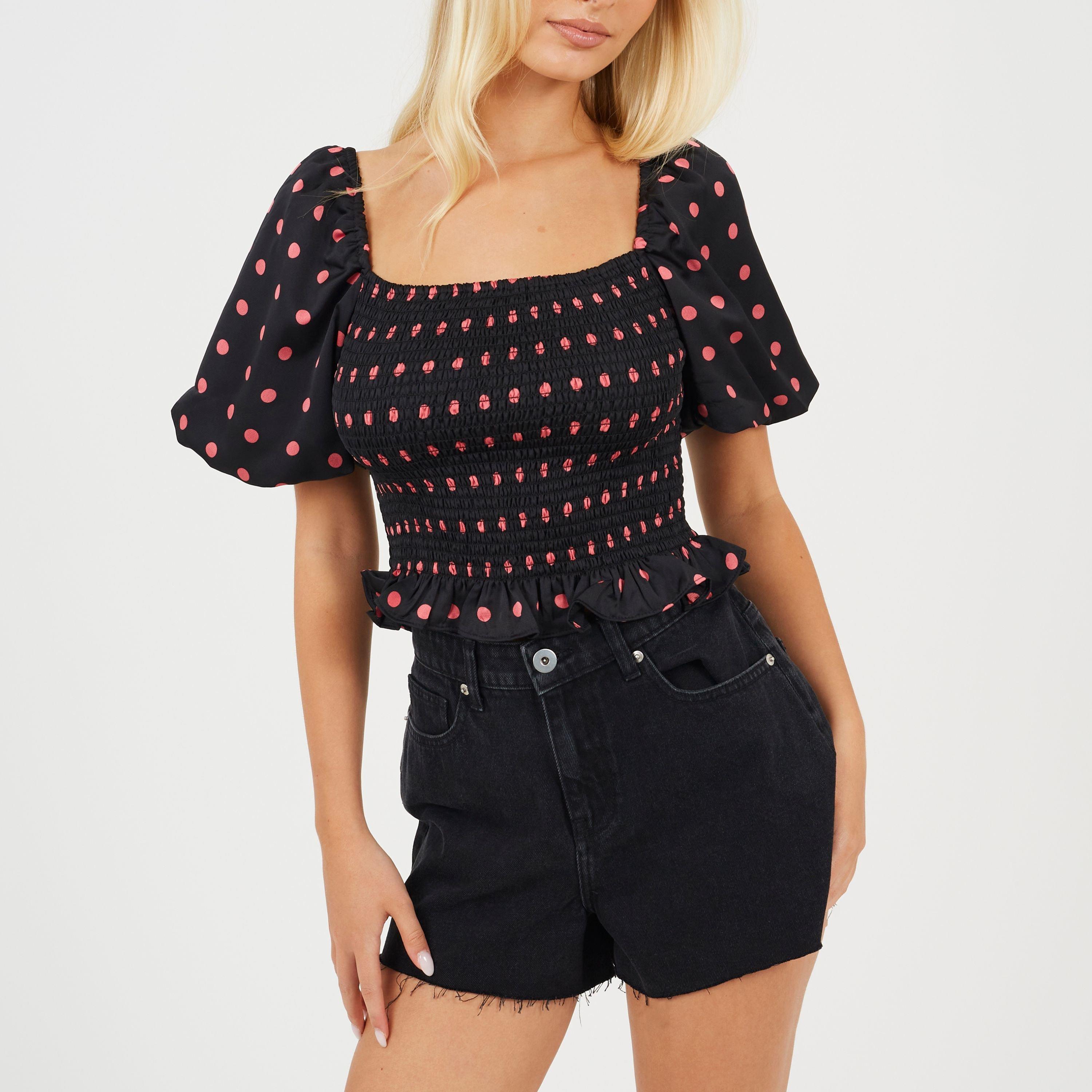 Womens Puff Sleeve Shirred Bust Polka Dot Top