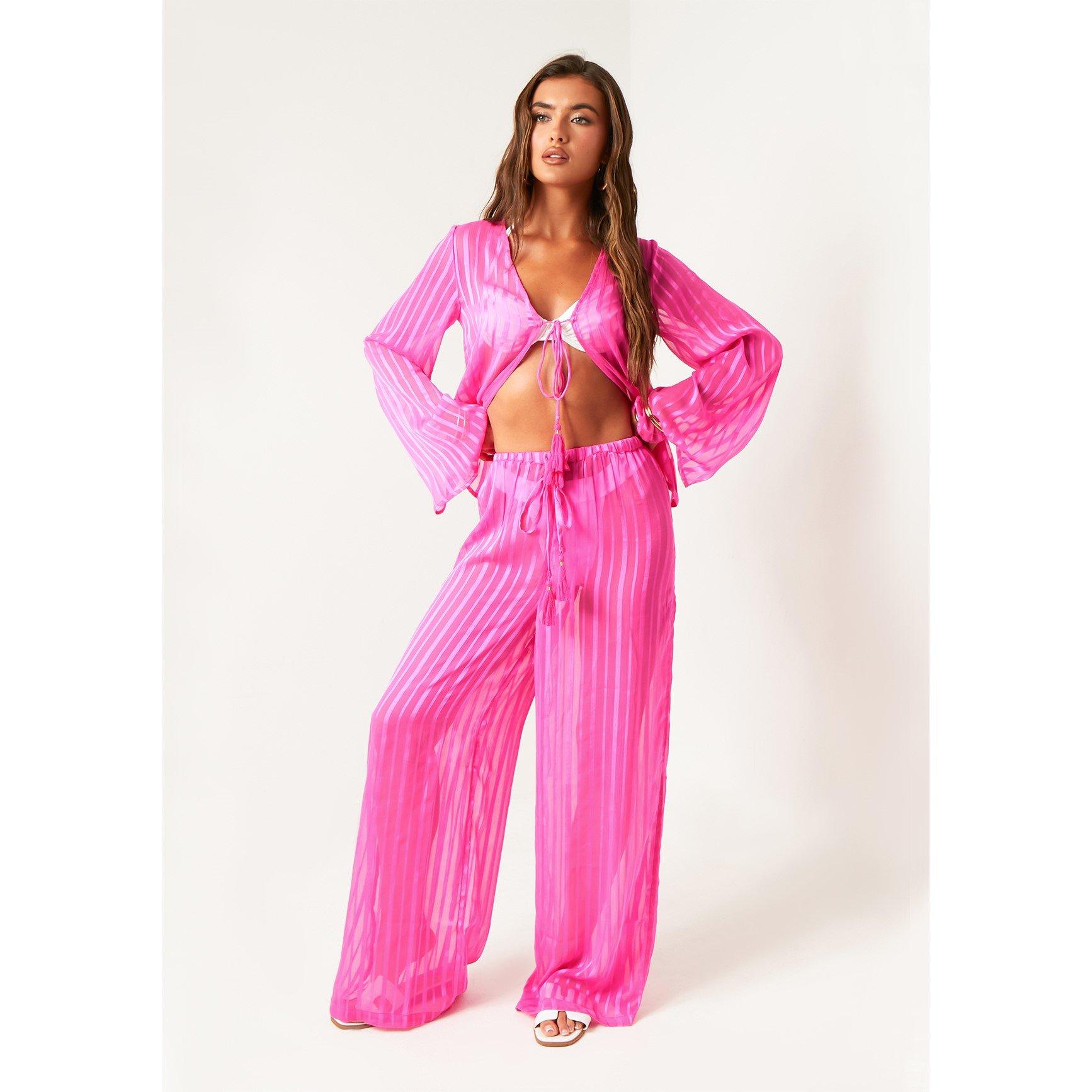 Zagrli bezbrižni plažni šik s prozirnim prugastim pokrivačem za plažu. Ove prozračne hlače imaju nježne prozirne pruge, nudeći stilski, ali lagani sloj preko vašeg kupaćeg kostima. Savršene za opuštanje uz bazen ili šetnju uz more, spajaju udobnost s elegantnim dodirima.