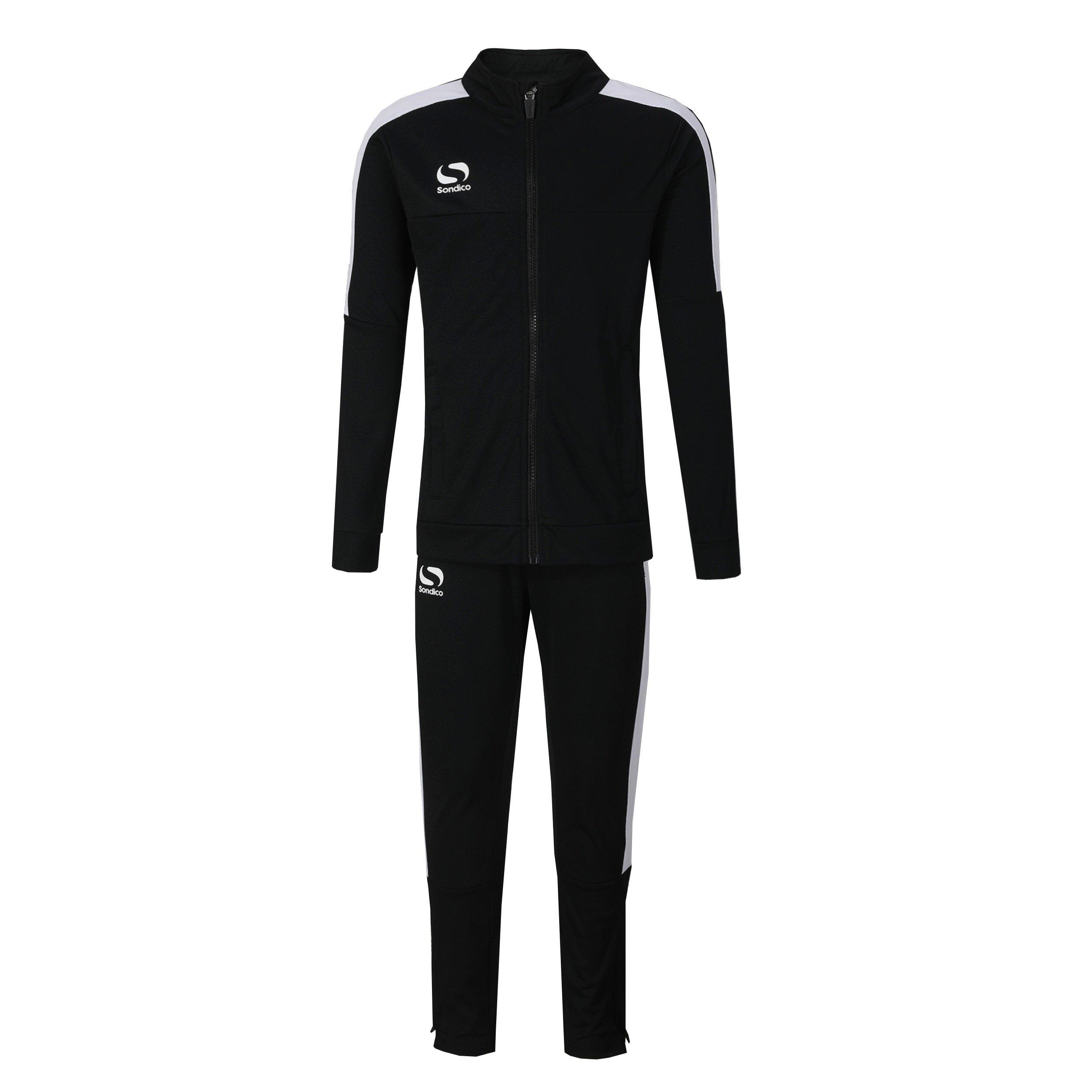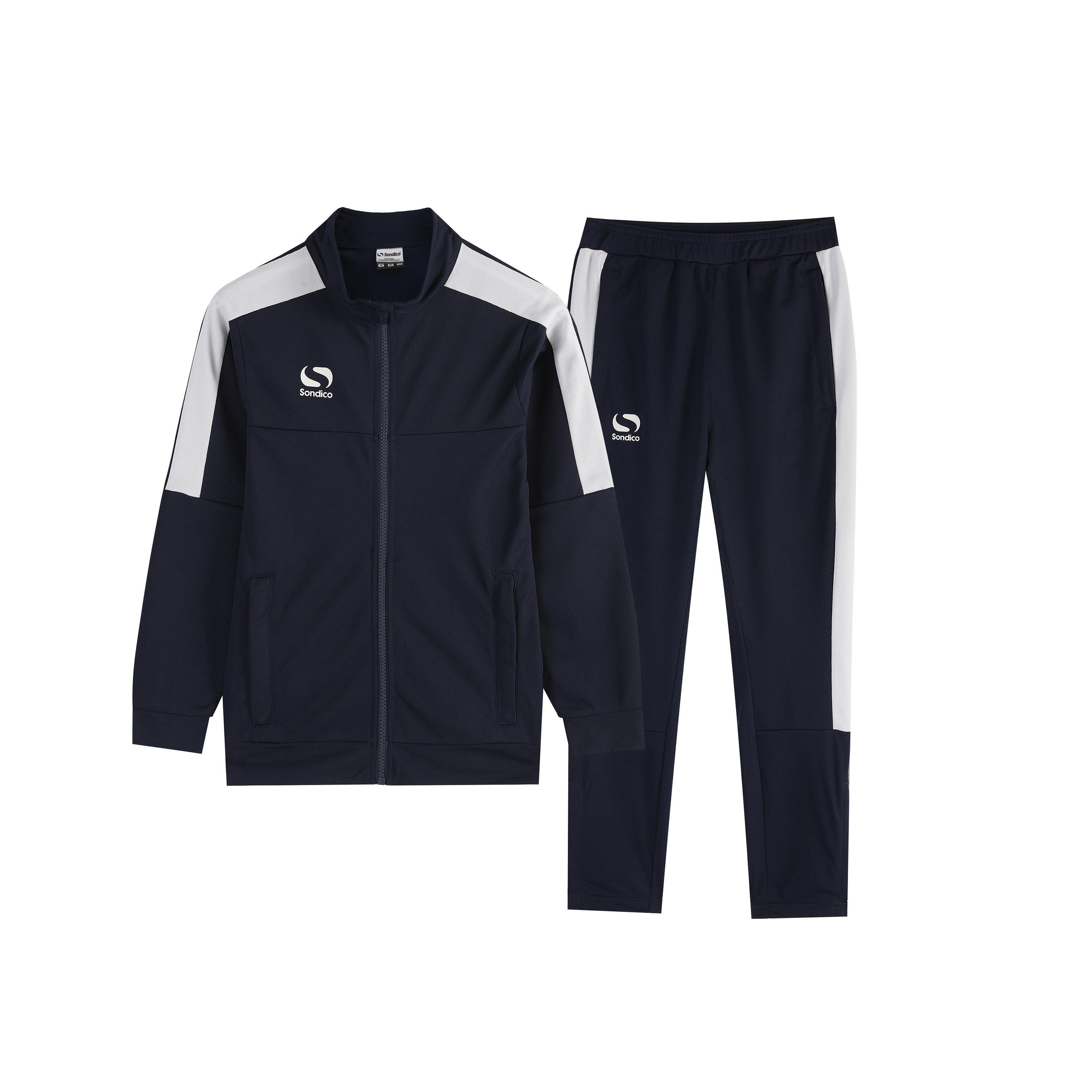 Ovaj Sondico Strike trenerka sastoji se od jakne s patentnim zatvaračem i donjeg dijela trenerke. Donji dio ima elastični pojas i patentni zatvarač na svakom gležnju, kako bi bilo lakše obući ih preko čizama. Jakna ima visoki ovratnik, dva džepa s patentnim zatvaračem i dizajnirana je kao sportska odjeća za izvedbu. Ovo je odlično za nogometni trening i pomoći će vam da postignete maksimalni potencijal.
