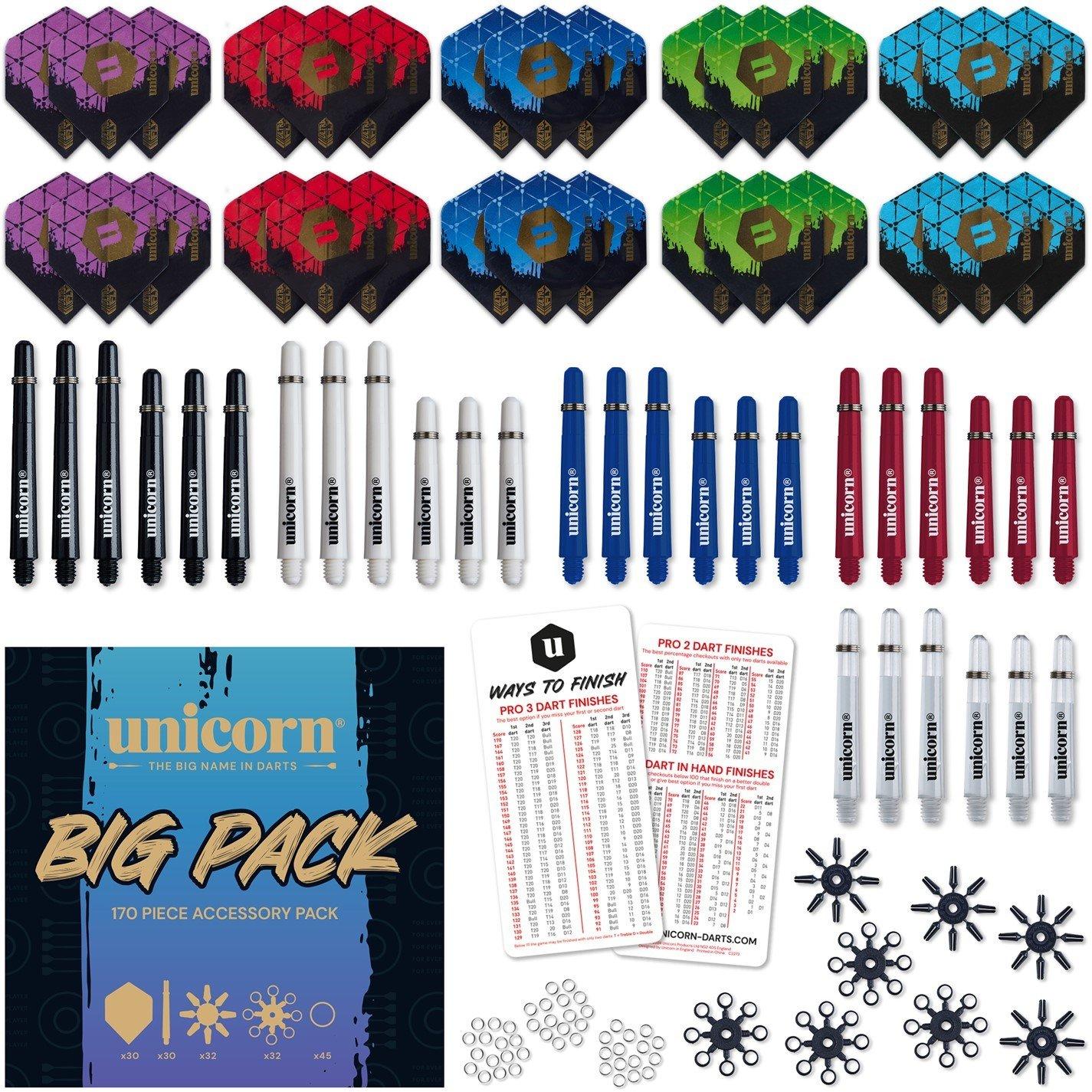 Containing all the essentials whether as replacements for breakages or to experiment with your darts set-up, Unicorn's Big Pack offers exceptional value for money Contents are as follows • Premium 100 micron flights in five colours - 10 sets • Gripper 4 Shafts - Medium in four colours - 4 sets • Gripper 4 Shafts - Long in two colours - 2 sets • Gripper 4 Shafts - Short in four colours - 4 sets • Stainless steel compression rings for Gripper shafts - 15 • Black flight protectors - 32 • Black ozone locking rings - 32 • Best ways to finish - Checkout card - 1